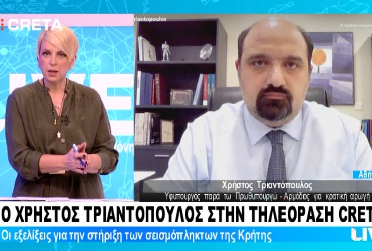 Με την Αντιγόνη Ανδρεάκη συζητήσαμε σχετικά με την εφαρμογή του κυβερνητικού σχεδίου στήριξης και αποκατάστασης στις σεισμόπληκτες περιοχές της Κρήτης. Μεταξύ άλλων, αναφερθήκαμε στην παράταση της προθεσμίας υποβολής ή τροποποίησης αιτήσεων στην πλατφόρμα arogi.gov.gr έως τις 28 Φεβρουαρίου, στον ρυθμό υποβολής αιτήσεων και πληρωμών πρώτης αρωγής, στη διαδικασία κατεδάφισης ετοιμόρροπων κτιρίων, στην εγκατάσταση οικίσκων για την κάλυψη των αναγκών στέγασης, αλλά και των τοπικών εκπαιδευτικών αναγκών, καθώς και στη δρομολόγηση από το Υπουργείο Ανάπτυξης ενός νέου εργαλείου στήριξης των άμεσα ή έμμεσα πληγεισών επιχειρήσεων.