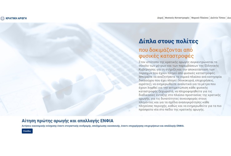 Σε λειτουργία τέθηκε ο ανανεωμένος ιστότοπος της κρατικής αρωγής (arogi.gov.gr), στον οποίο είναι συγκεντρωμένο το σύνολο των μέτρων στήριξης που προωθεί η Κυβέρνηση στις περιοχές που έχουν πληγεί από φυσικές καταστροφές. Μέσω του site, οι πληγέντες από φυσικές καταστροφές μπορούν να υποβάλουν αίτηση για χορήγηση πρώτης αρωγής, όπου προβλέπεται. Ο ιστότοπος είναι σχεδιασμένος ώστε να είναι απλός και φιλικός προς τον χρήστη, παρέχοντάς του χρήσιμη ενημέρωση σχετικά με τα μέτρα που σχεδιάζει και υλοποιεί η Κυβέρνηση προκειμένου να ανακουφίσει τους πληγέντες από φυσικές καταστροφές.