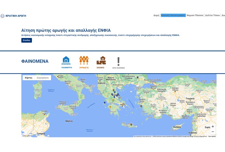 Στην ενότητα «Φυσικές Καταστροφές» υπάρχουν ξεχωριστά τα τελευταία συμβάντα φυσικών καταστροφών, αποτυπωμένα με πινέζες πάνω στον χάρτη της Ελλάδας, ενώ υπάρχει και κατηγοριοποίηση ανά κατηγορία φαινομένου. Σε κάθε συμβάν είναι καταγεγραμμένο το σύνολο των μέτρων στήριξης και αποκατάστασης που σχεδίασε και υλοποιεί η Κυβέρνηση, μαζί με τα πρόσφατα δελτία τύπου, αλλά και το σύνολο των σχετικών αποφάσεων και εγκυκλίων.