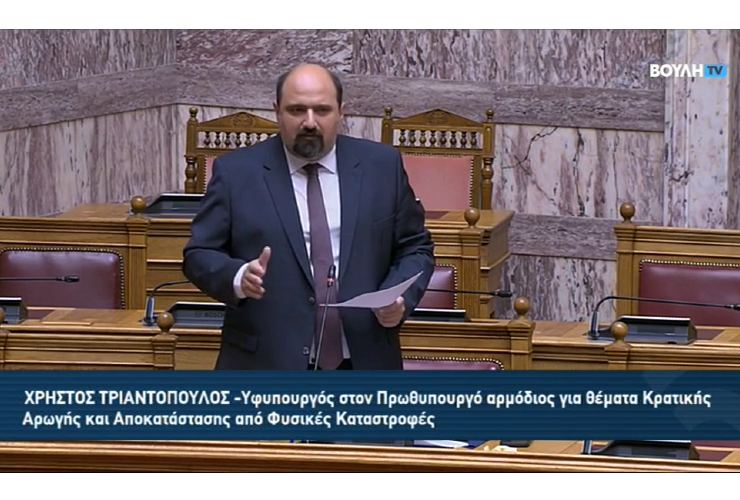 Ο Υφυπουργός στον Πρωθυπουργό, Αρμόδιος για Θέματα Κρατικής Αρωγής και Αποκατάστασης από Φυσικές Καταστροφές, κ. Χρήστος Τριαντόπουλος, απάντησε τη Δευτέρα 24 Οκτωβρίου 2022 στην επίκαιρη ερώτηση του Βουλευτή Ηρακλείου, κ. Βασίλη Κεγκέρογλου, με θέμα τα κυβερνητικά μέτρα στήριξης των πλημμυροπαθών στην Κρήτη και την υλοποίηση των έργων αποκατάστασης και προστασίας μετά τα ακραία καιρικά φαινόμενα της 15ης Οκτωβρίου.