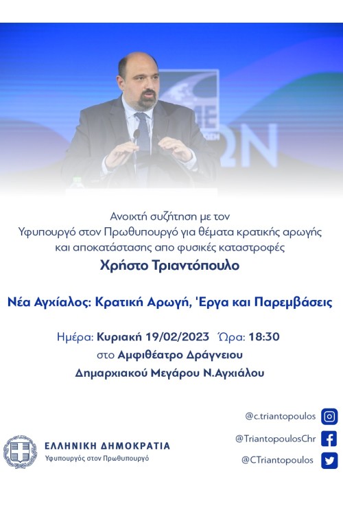 Ο Υφυπουργός στον Πρωθυπουργό, Αρμόδιος για Θέματα Κρατικής Αρωγής και Αποκατάστασης από Φυσικές Καταστροφές και υποψήφιος Βουλευτής με τη Νέα Δημοκρατία στη Μαγνησία, κ. Χρήστος Τριαντόπουλος, θα παραθέσει ομιλία στο Αμφιθέατρο του Δράγνειου Δημαρχιακού Μεγάρου Νέας Αγχιάλου, την Κυριακή 19 Φεβρουαρίου, στις 18.30.