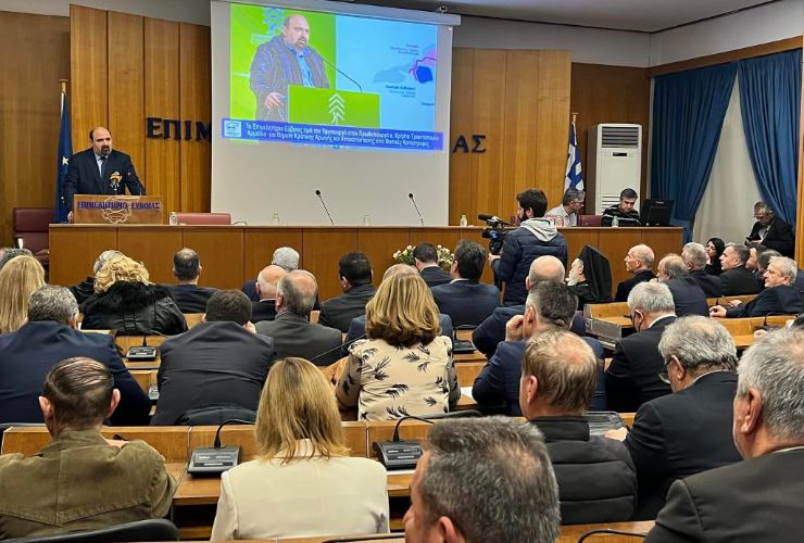 Τον Υφυπουργό στον Πρωθυπουργό, Αρμόδιο για Θέματα Κρατικής Αρωγής και Αποκατάστασης από Φυσικές Καταστροφές, κ. Χρήστο Τριαντόπουλο, βράβευσε την Τετάρτη 22 Φεβρουαρίου 2023, το Επιμελητήριο Εύβοιας, στο πλαίσιο εκδήλωσης για την κοπή της βασιλόπιτας. Ειδικότερα, στη γεμάτη από κόσμο αίθουσα συνεδριάσεων του Επιμελητηρίου, με την παρουσία του Μητροπολίτη Χαλκίδος κ. Χρυσοστόμου, του Υφυπουργού Αγροτικής Ανάπτυξης και Τροφίμων κ. Σίμου Κεδίκογλου, των βουλευτών ΝΔ στην Εύβοια, του Περιφερειάρχη Στερεάς Ελλάδας, κ. Φάνη Σπανού, του Αντιπεριφερειάρχη ΠΕ Εύβοιας κ. Γιώργου Κελαϊδίτη, και των Δημάρχων Ιστιαίας-Αιδηψού και Μαντουδίου-Λίμνης-Αγίας Άννας, κκ. Γιάννη Κοτζιά και Γιώργου Τσαπουρνιώτη, ο Πρόεδρος κ. Γιάννης Γεροντίτης και η Διοικούσα Επιτροπή του Επιμελητηρίου Εύβοιας βράβευσαν τον κ. Χρήστο Τριαντόπουλο για το έργο στήριξης και αποκατάστασης της Βόρειας Εύβοιας μετά τις καταστροφικές πυρκαγιές του 2021.