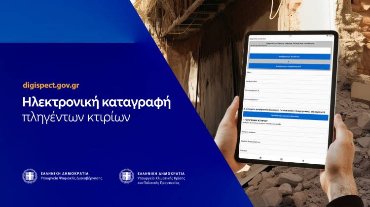 Τη νέα ψηφιακή εφαρμογή «Digispect» για την ψηφιοποίηση της διαδικασίας αυτοψιών και καταγραφής των κτιρίων που πλήττονται από μία φυσική καταστροφή, ανακοίνωσαν σήμερα, 10 Ιουλίου, στο πλαίσιο συνάντησης στο Υπουργείο Ψηφιακής Διακυβέρνησης, ο Υπουργός Ψηφιακής Διακυβέρνησης Δημήτρης Παπαστεργίου και ο Υφυπουργός Κλιματικής Κρίσης και Πολιτικής Προστασίας Χρήστος Τριαντόπουλος, με τη συμμετοχή του Γενικού Γραμματέα Αποκατάστασης Φυσικών Καταστροφών και Κρατικής Αρωγής, Πέτρου Καμπούρη.