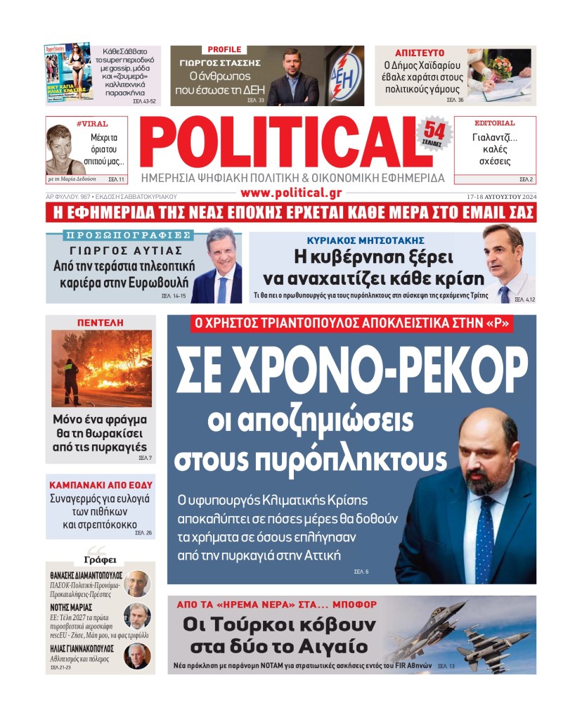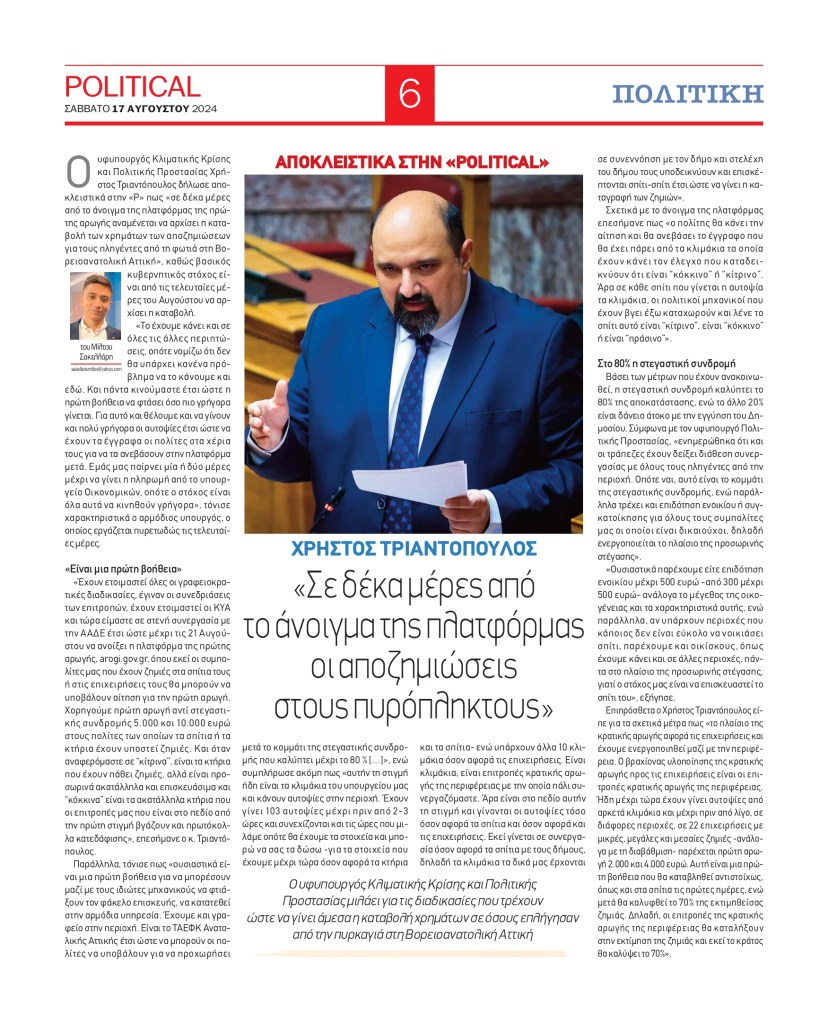 Δηλώσεις του Υφυπουργού Κλιματικής Κρίσης και Πολιτικής Προστασίας, Χρήστου Τριαντόπουλου, στην ηλεκτρονική εφημερίδα “Political” και στο δημοσιογράφο Μίλτο Σακελλάρη.