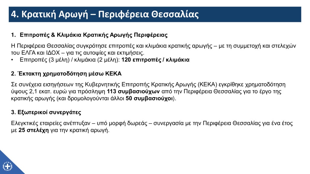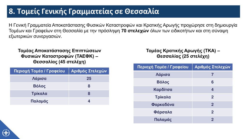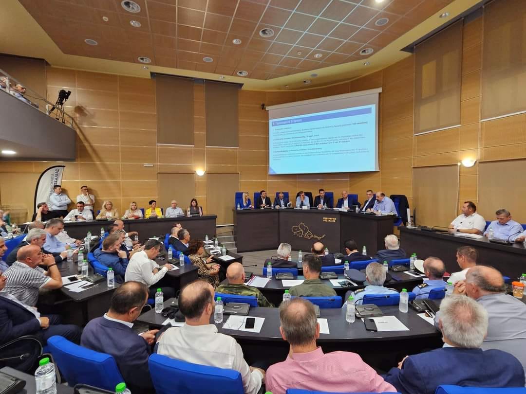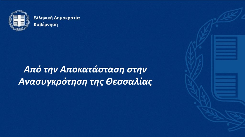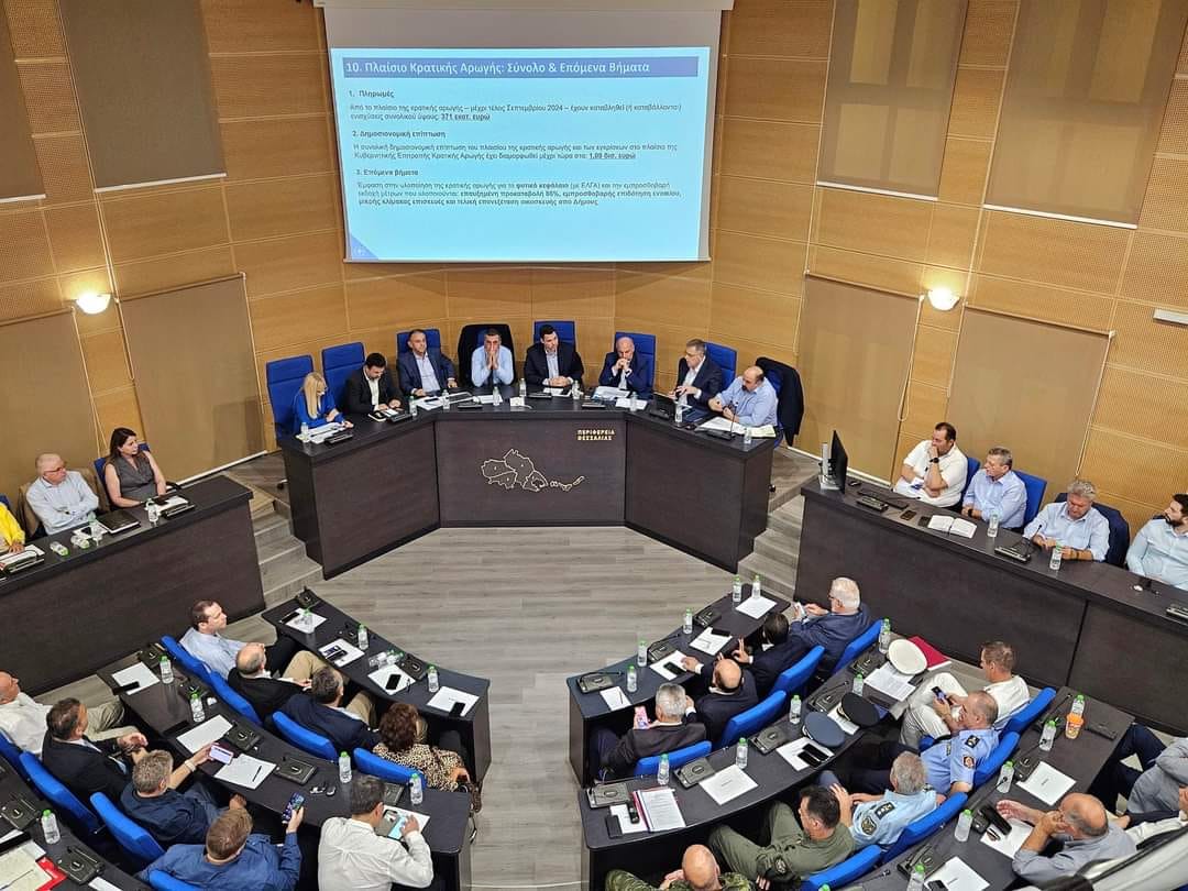 Την Παρασκευή, 27 Σεπτεμβρίου 2024, Κυβερνητικό Κλιμάκιο παρουσίασε στη Λάρισα, στην έδρα της Περιφέρειας Θεσσαλίας, την υλοποίηση του σχεδίου στήριξης και αποκατάστασης μετά το ακραίο πλημμυρικό φαινόμενο ‘Daniel’ στη Θεσσαλία και στις όμορες περιοχές που επλήγησαν από την πρωτόγνωρη κακοκαιρία. Στο Κυβερνητικό Κλιμάκιο συμμετείχαν ο Υπουργός Αγροτικής Ανάπτυξης και Τροφίμων, κ. Κώστας Τσιάρας, ο Υφυπουργός Υποδομών και Μεταφορών, κ. Νίκος Ταχιάος, ο Υφυπουργός Αγροτικής Ανάπτυξης και Τροφίμων, κ. Χρήστος Κέλλας, ο Υφυπουργός Κλιματικής Κρίσης και Πολιτικής Προστασίας, κ. Χρήστος Τριαντόπουλος, ο Υφυπουργός στον Πρωθυπουργό, κ. Θανάσης Κοντογεώργης, ο Γενικός Γραμματέας Αγροτικής Ανάπτυξης και Τροφίμων, κ. Γιώργος Στρατάκος, η Γενική Γραμματέας Συντονισμού, κ. Εύη Δραμαλιώτη, και ο Πρόεδρος του ΕΛΓΑ, κ. Ανδρέας Λυκουρέντζος, ενώ στην παρουσίαση συμμετείχε και ο Περιφερειάρχης Θεσσαλίας, κ. Δημήτρης Κουρέτας. Στην παρουσίαση της πορείας υλοποίησης του σχεδίου στήριξης και αποκατάστασης από το Κυβερνητικό Κλιμάκιο συμμετείχαν οι βουλευτές των νομών Λάρισας, Τρικάλων και Καρδίτσας, Αντιπεριφερειάρχες, Δήμαρχοι, εκπρόσωποι επιμελητηριακών οργανώσεων, αγροτικών συνεταιρισμών, αυτοδιοικητικόι, επιχειρηματίες, αγρότες, κτηνοτρόφοι και πολίτες της Θεσσαλίας.