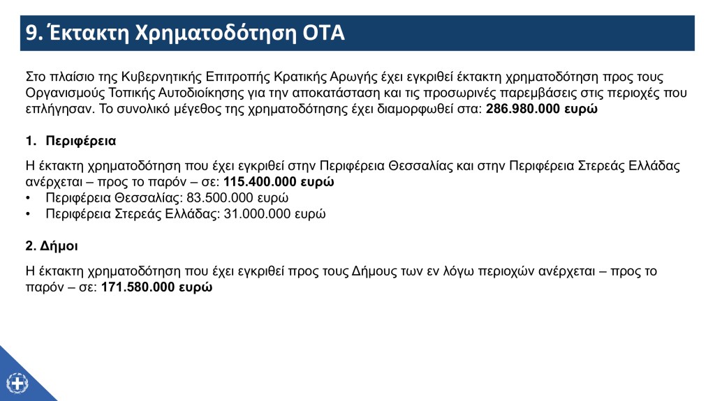 Από αυτές τις πληρωμές των 371 εκατ. ευρώ, το μεγαλύτερο μέρος, δηλαδή τα 318 εκατ. ευρώ, είναι το πλαίσιο της κρατικής αρωγής, που περιλαμβάνει την πρώτη αρωγή, τις προκαταβολές του 50% της κρατικής αρωγής, αλλά και την επαυξημένη προκαταβολή του 86% της κρατικής αρωγής προς επιχειρήσεις και αγρότες που ανακοινώθηκε προ ημερών. Έτσι, μετά την οδηγία του Πρωθυπουργού, Κυριάκου Μητσοτάκη, και τη συνεργασία του Υπουργείου Κλιματικής Κρίσης και Πολιτικής Προστασίας με το Υπουργείο Εθνικής Οικονομίας και Οικονομικών, ενεργοποιήθηκε η επαυξημένη προκαταβολή του 86% της κρατικής. Από την προηγούμενη εβδομάδα ξεκίνησε η έκδοση των σχετικών Υπουργικών Αποφάσεων και οι πληρωμές στις περιπτώσεις των επιχειρήσεων και των αγροτών που έχουν ήδη λάβει το 50% της κρατικής αρωγής. Πρόκειται για περίπου 16.000 επιχειρήσεις και αγρότες. Και οι εν λόγω πληρωμές διαμορφώνονται στα 63 εκατ. ευρώ, με τις καταβολές να έχουν ξεκινήσει από την περασμένη Παρασκευή και να συνεχίζονται σε καθημερινή βάση μέχρι τέλος του μήνα. Μία σημαντική καταβολή, αυτή των 63 εκατ. ευρώ, εντός δέκα ημερών. Με την ολοκλήρωση των καταβολών, εντός των επόμενων ημερών, προς τις περιπτώσεις των επιχειρήσεων και των αγροτών που έχουν λάβει το 50% της κρατικής αρωγής, θα προχωρήσει η επαυξημένη προκαταβολή του 86% της κρατικής αρωγής και σε όσους δεν έχουν λάβει ακόμα προκαταβολή, μετά από την αποστολή των στοιχείων τους από την Περιφέρεια Θεσσαλίας στην κεντρική υπηρεσία του Υπουργείου. Στόχος είναι αφού ολοκληρωθεί στο μέγιστο βαθμό η καταβολή του 86% της κρατικής αρωγής – ανάλογα με τη ροή των στοιχείων από την Περιφέρεια Θεσσαλίας – να προχωρήσει και η διαδικασία για την τελική επιχορήγηση, το υπόλοιπο 14% της κρατικής αρωγής.