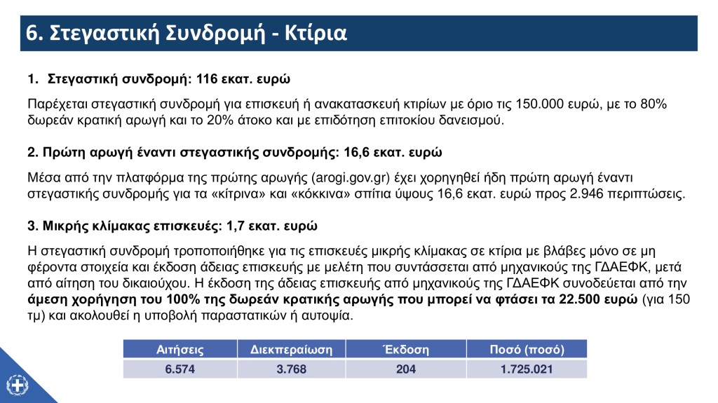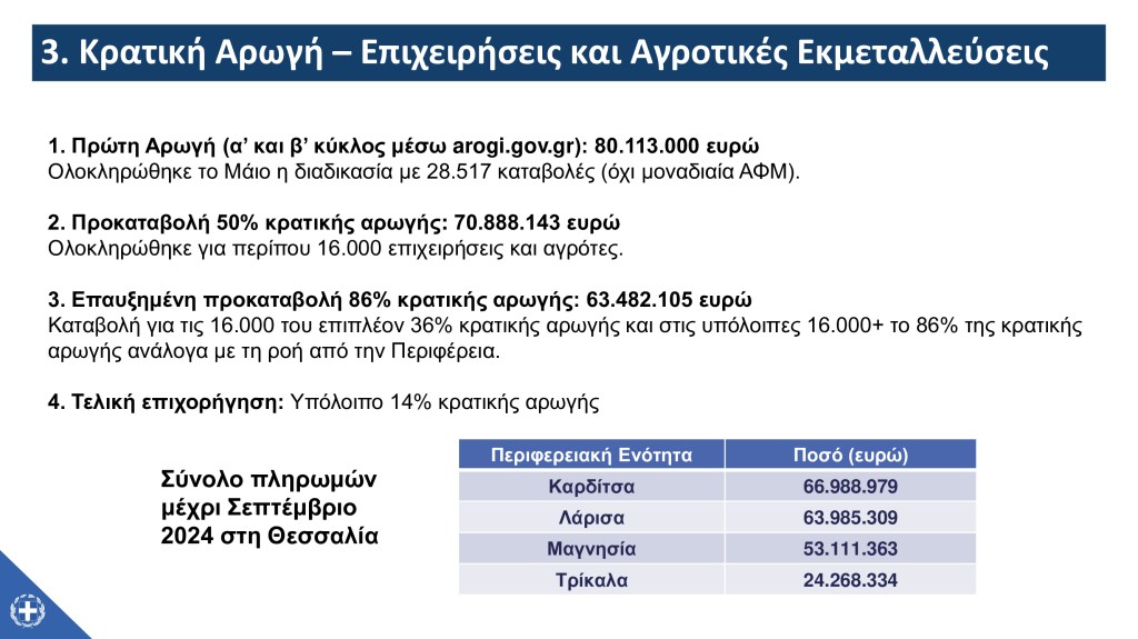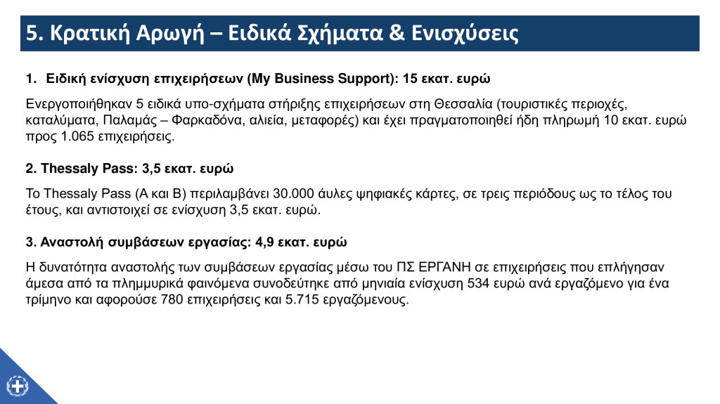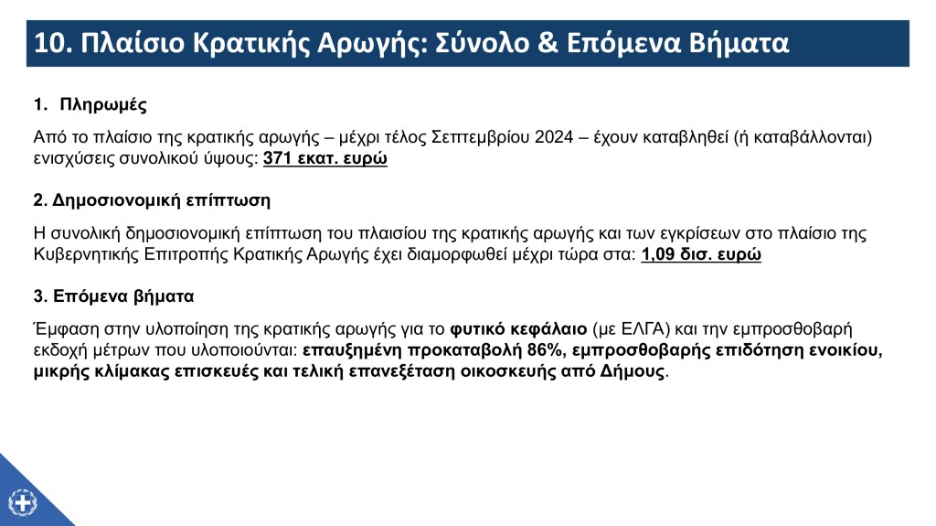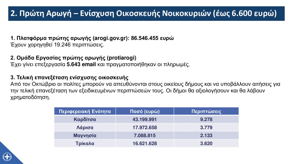 Επίσης, ο Υφυπουργός σημείωσε τα επόμενα βήματα του μηχανισμού της κρατικής αρωγής, υπογραμμίζοντας πως – παράλληλα με την υλοποίηση της επαυξημένης προκαταβολής και της τελικής επιχορήγησης προς επιχειρήσεις και αγρότες – η έμφαση θα δοθεί στην υλοποίηση του σχήματος για την αρωγή ως προς το φυτικό κεφάλαιο σε συνεργασία με τον ΕΛΓΑ, καθώς και στην εμπροσθοβαρή επιδότηση ενοικίου, στις μικρής κλίμακας επισκευές για τα χαρακτηρισμένα ως «πράσινα» ή «κίτρινα» κτίρια και στην τελική επανεξέταση της οικοσκευής από τους δήμους.