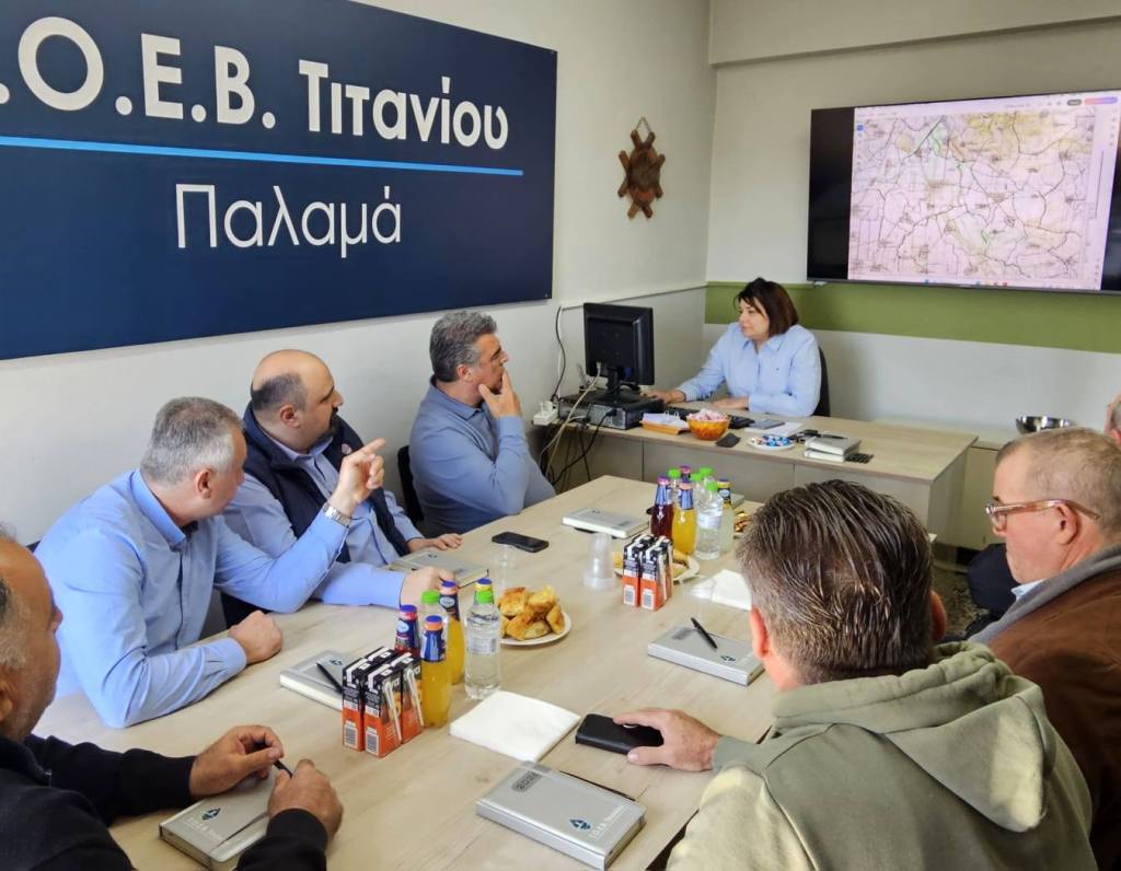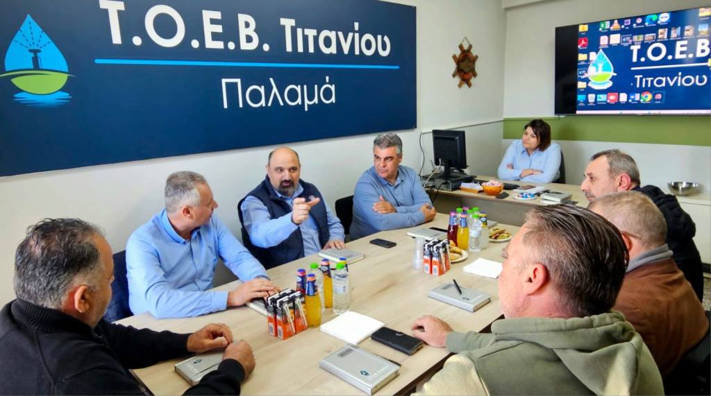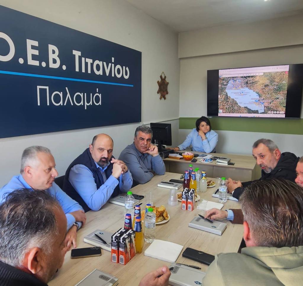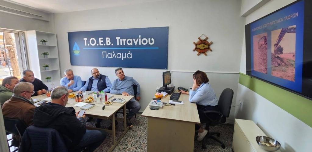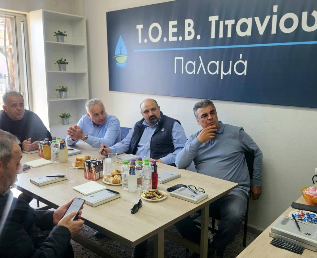Στη συνέχεια, ο βουλευτής, κ. Χρήστος Τριαντόπουλος, επισκέφθηκε τα γραφεία του Τοπικού Οργανισμού Εγγείων Βελτιώσεων (ΤΟΕΒ) Τιτανίου στον Παλαμά, όπου είχε συνάντηση εργασίας με τον Πρόεδρο, κ. Βασίλη Γιαννάκο, και τα μέλη του Διοικητικού Συμβουλίου του οργανισμού. Κατά τη διάρκεια της συνάντησης εργασίας, η διοίκηση του ΤΟΕΒ παρουσίασε την υλοποίηση των έργων και παρεμβάσεων αποκατάστασης των υποδομών και των δικτύων που είχαν πληγεί από τη θεομηνία “Daniel”. Επρόκειτο για παρεμβάσεις και έργα, για τη χρηματοδότηση των οποίων είχαν συνεργαστεί με τον κ. Χρήστο Τριαντόπουλο κατά την περίοδο της θητείας του στο Υπουργείο Κλιματικής Κρίσης και Πολιτικής Προστασίας. Παράλληλα, η διοίκηση του ΤΟΕΒ Τιτανίου ανέλυσε τα ζητήματα που προκύπτουν στην άρδευση των αγροτικών εκτάσεων της περιοχής του Παλαμά ως συνέπεια των δυσμενών συνθηκών που δημιουργούνται από την κλιματική κρίση.