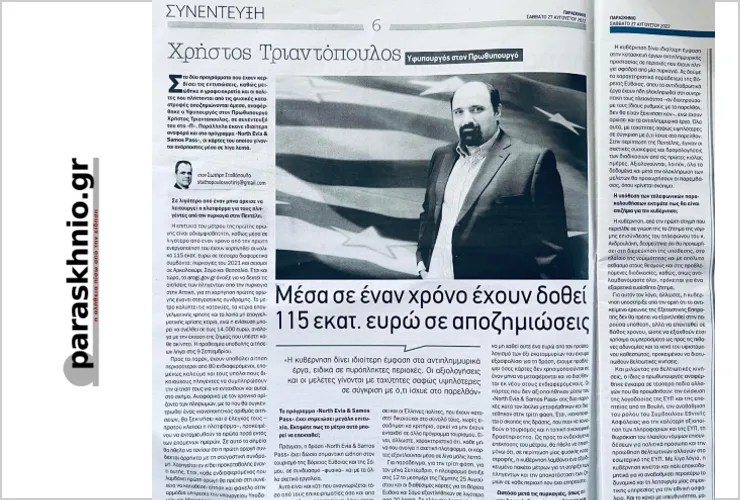Στα δύο προγράμματα που έχουν κερδίσει τις εντυπώσεις, καθώς μειώθηκε η γραφειοκρατία και οι πολίτες που πλήττονται από τις φυσικές καταστροφές αποζημιώνονται άμεσα, αναφέρθηκε ο Υφυπουργός στον Πρωθυπουργό Χρήστος Τριαντόπουλος, σε συνέντευξή του στο «Π». Παράλληλα έκανε ιδιαίτερη αναφορά και στο πρόγραμμα «North Evia & Samos Pass», οι κάρτες του οποίου γίνονται ανάρπαστες μέσα σεΣυνέχεια ανάγνωσης «Συνέντευξη στην εφημερίδα «Το Παρασκήνιο» (27.08.2022)»