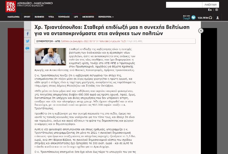 Σταθερή επιδίωξη της κυβέρνησης είναι η συνεχής βελτίωση των διαδικασιών και η αξιοποίηση νέων εργαλείων, ώστε να ανταποκρίνεται στις ανάγκες των πολιτών στις νέες συνθήκες που έχει διαμορφώσει η κλιματική κρίση, τονίζει στο ΑΠΕ-ΜΠΕ ο Υφυπουργός στον Πρωθυπουργό, Αρμόδιος για Θέματα Κρατικής Αρωγής και Αποκατάστασης από Φυσικές Καταστροφές, Χρήστος Τριαντόπουλος. Ο κ. Τριαντόπουλος τονίζει ότιΣυνέχεια ανάγνωσης «Συνέντευξη στο Αθηναϊκό-Μακεδονικό Πρακτορείο Ειδήσεων (24.12.2022)»