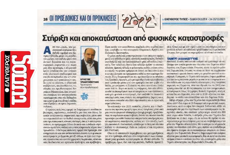 Κύριε Υπουργέ, τα δυο τελευταία χρόνια έχουν καταγραφεί σημαντικές φυσικές καταστροφές, σε διάφορες περιοχές της χώρας. Αν εξαιρέσουμε τους σεισμούς, τα αποτελέσματα των υπολοίπων ήταν απότοκος της έλλειψης υποδομών ή της έντασης των φαινομένων;Η κλιματική κρίση έχει αλλάξει τα δεδομένα, με αποτέλεσμα να είναι πιο πιθανό από ό,τι στο παρελθόν να έχουμε φυσικές καταστροφές, ενώΣυνέχεια ανάγνωσης «Συνέντευξη στο περιοδικό «Ασφαλιστικό ΝΑΙ» (Νοέμβριος-Δεκέμβριος 2021)»