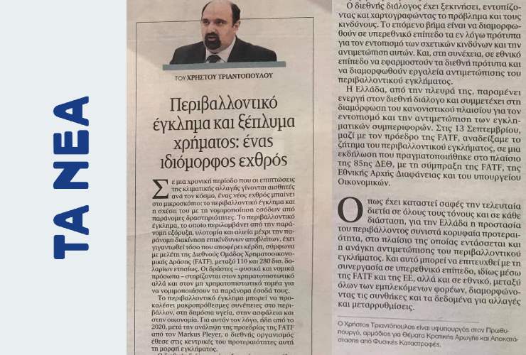 Σε μία χρονική περίοδο που οι επιπτώσεις της κλιματικής αλλαγής γίνονται αισθητές ανά τον κόσμο, ένας νέος εχθρός μπαίνει στο μικροσκόπιο: το περιβαλλοντικό έγκλημα και η σχέση του με τη νομιμοποίηση εσόδων από παράνομες δραστηριότητες. Το περιβαλλοντικό έγκλημα, το οποίο περιλαμβάνει από την παράνομη εξόρυξη, υλοτομία και αλιεία μέχρι την παράνομη διακίνηση επικίνδυνων αποβλήτων, έχειΣυνέχεια ανάγνωσης «Περιβαλλοντικό έγκλημα και ξέπλυμα χρήματος: ένας ιδιόμορφος εχθρός»