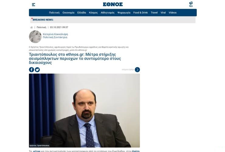 Συνέντευξη στο ethnos.gr: Μέτρα στήριξης σεισμόπληκτων περιοχών το συντομότερο στους δικαιούχους