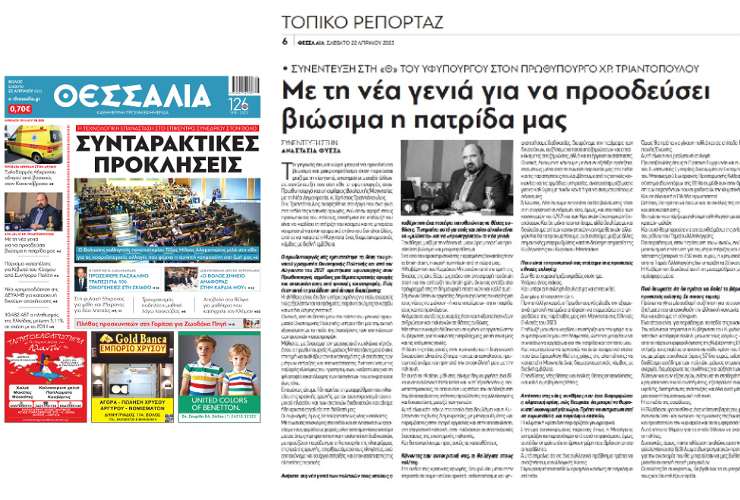Κύριε Υπουργέ από την προηγούμενη συνέντευξή μας, έγιναν πολλά στην πατρίδα μας και εσείς, ως έμπιστος του Πρωθυπουργού, σε θέση κλειδί παίξατε πετυχημένα πολύ τον ρόλο σας. Γι’ αυτό άλλωστε το αξίωμα του Υφυπουργού. Μας κάνετε μία λεπτομερή ανασκόπηση των ενεργειών σας όλο αυτό το διάστημα;Αγαπητή κυρία Τσακνάκη Γαβαλά, κατά τη διετία που προηγήθηκε, υλοποιήθηκε,Συνέχεια ανάγνωσης «Συνέντευξη στην εφημερίδα «Κυριακάτικη Θεσσαλία» (19.09.2021)»